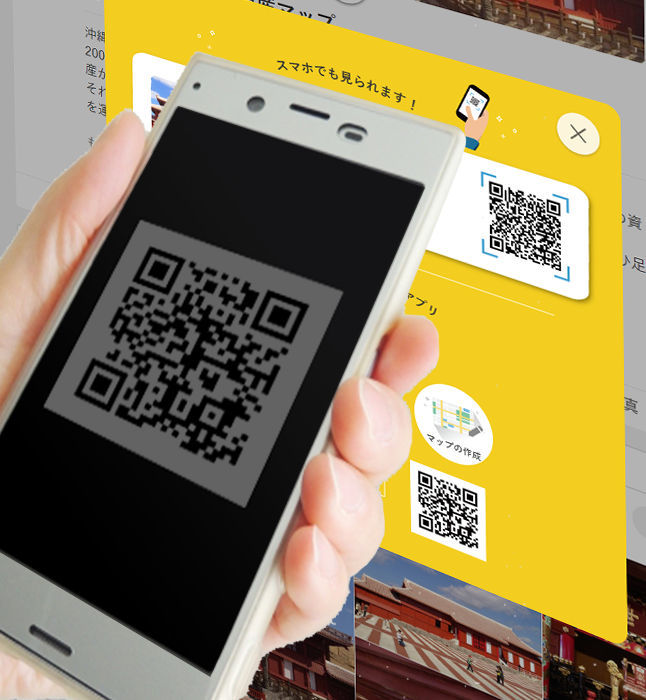 QRコードを読み取ることで、サイネージで表示しているコンテンツをスマートフォンで見ることができます。情報をスマートフォンで持ち歩けるので、スポットまでのナビゲーションも可能です。